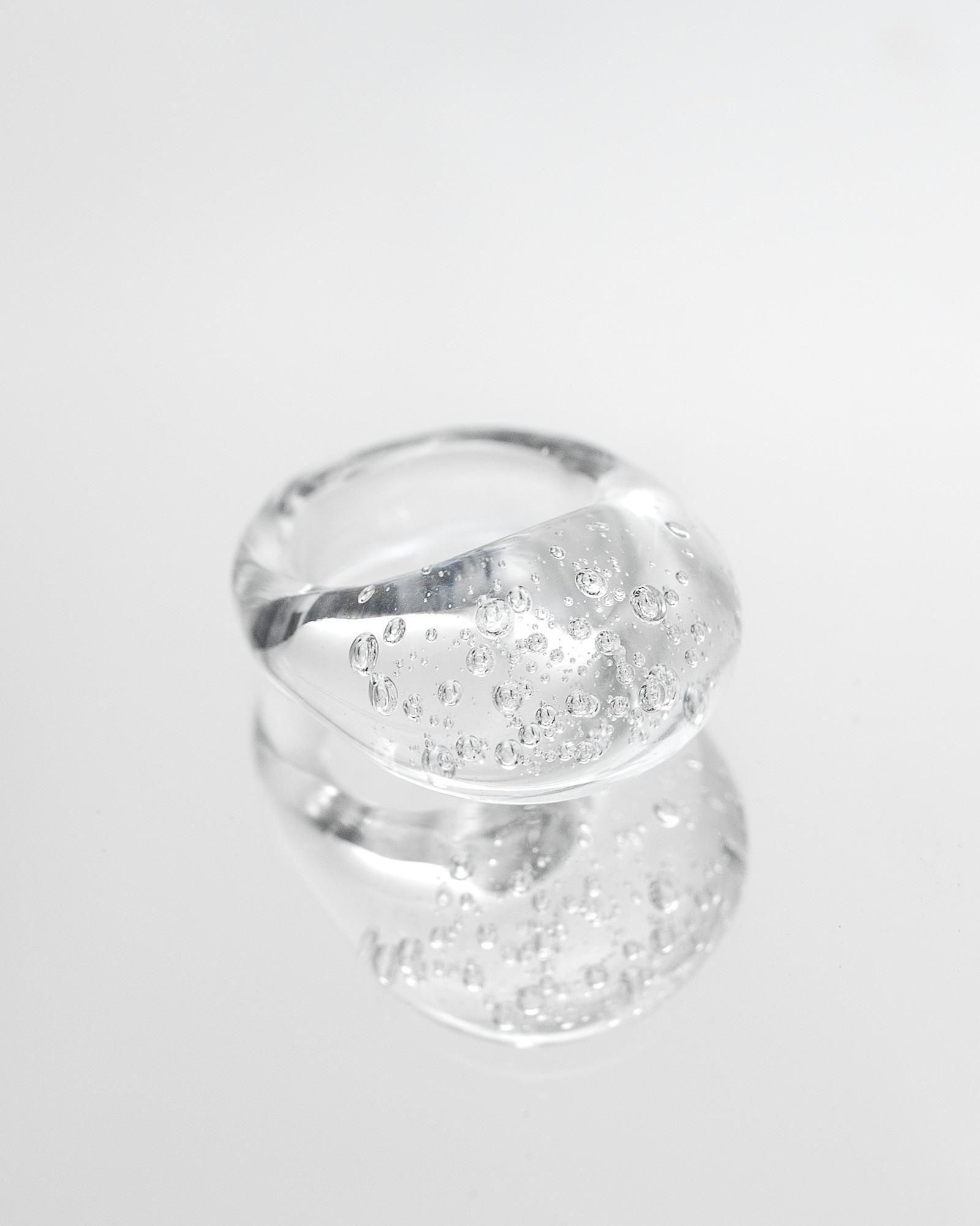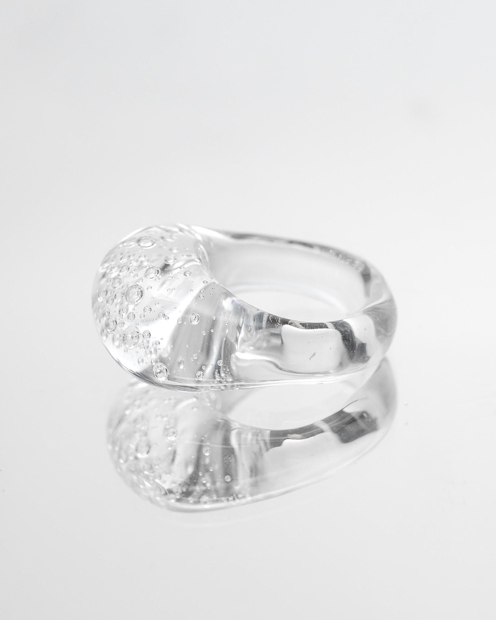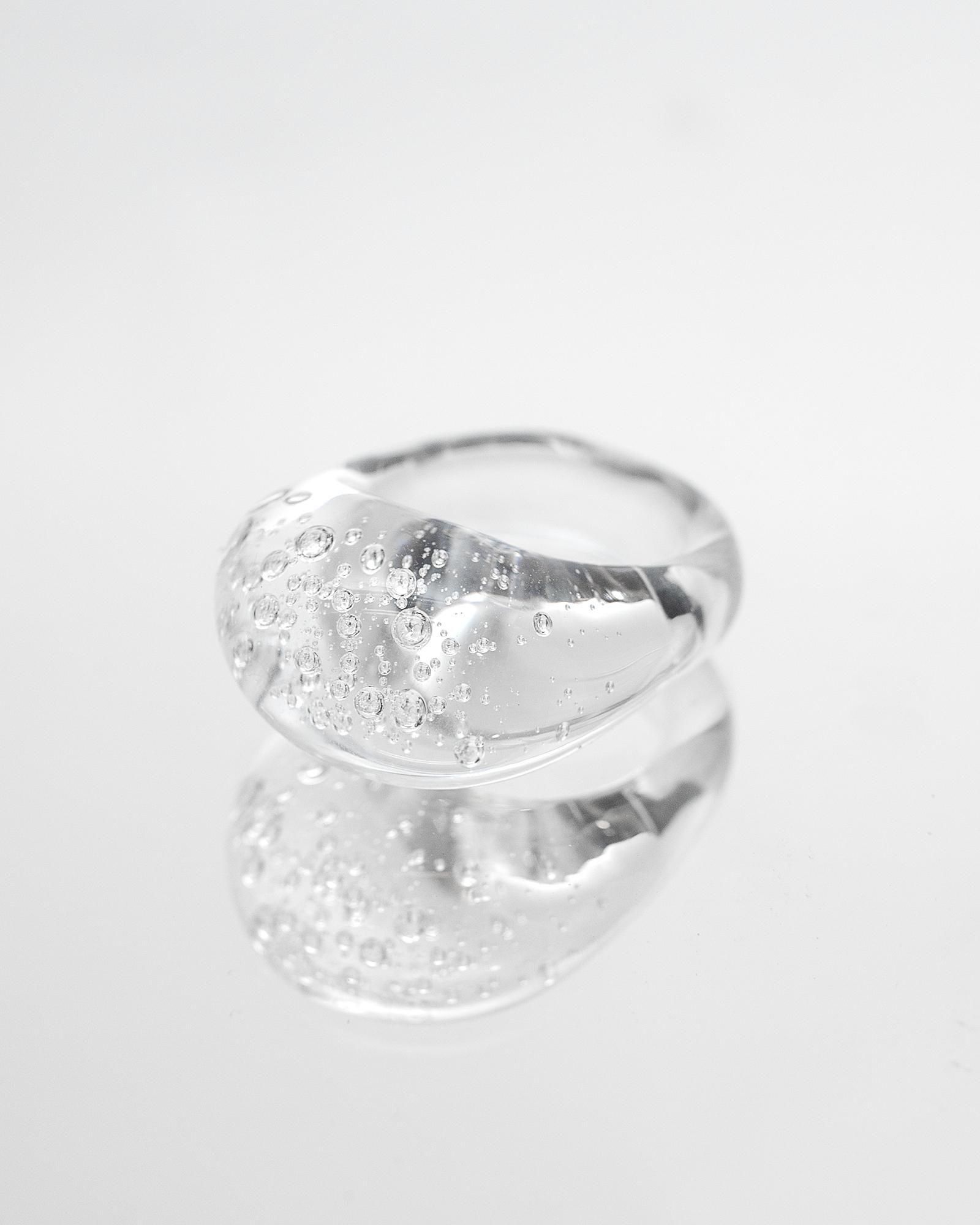 気泡が舞う一瞬の美しさをランプワークによってガラスの中に閉じ込めたデザインがとても印象的なリングです。