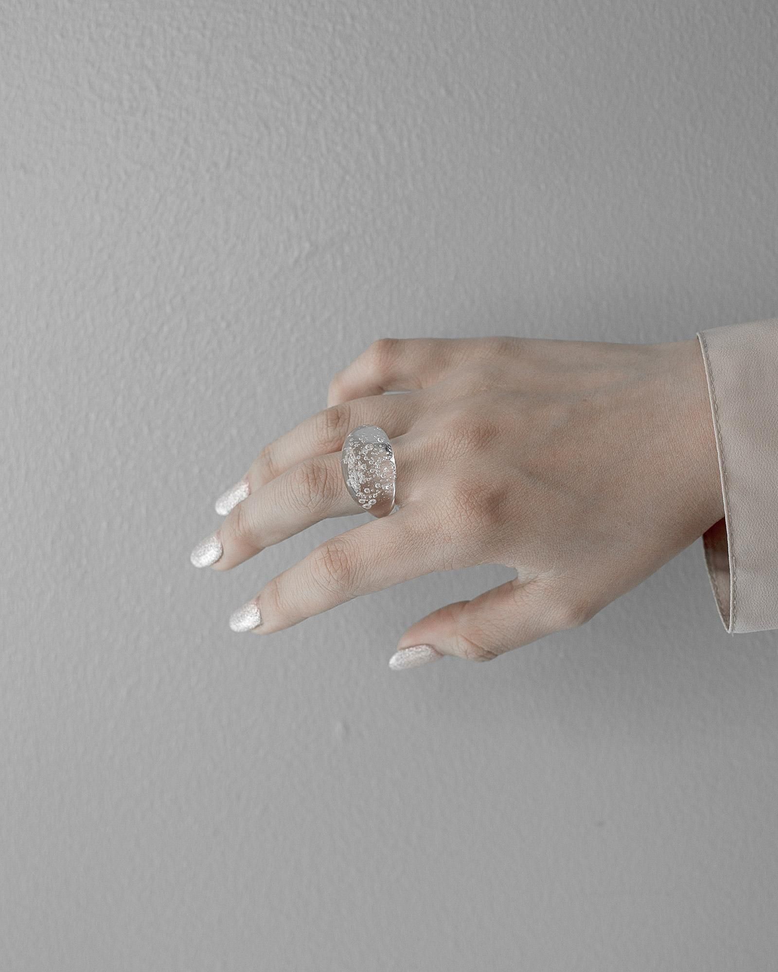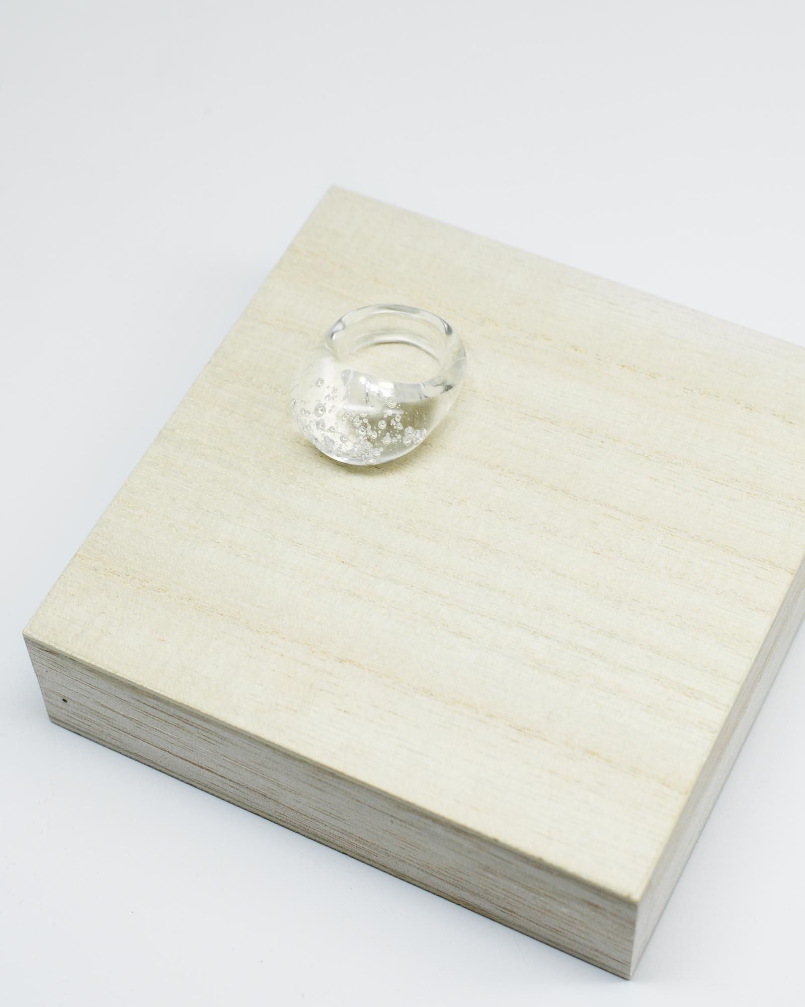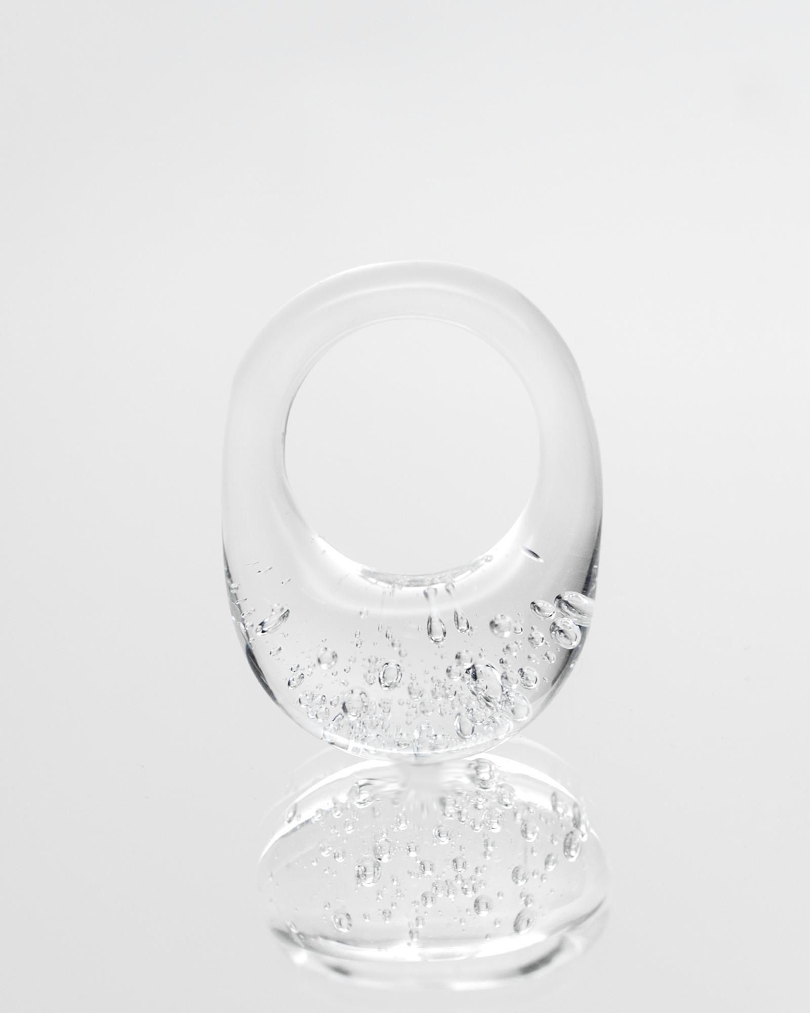 気泡が舞う一瞬の美しさをランプワークによってガラスの中に閉じ込めたデザインがとても印象的なリングです。