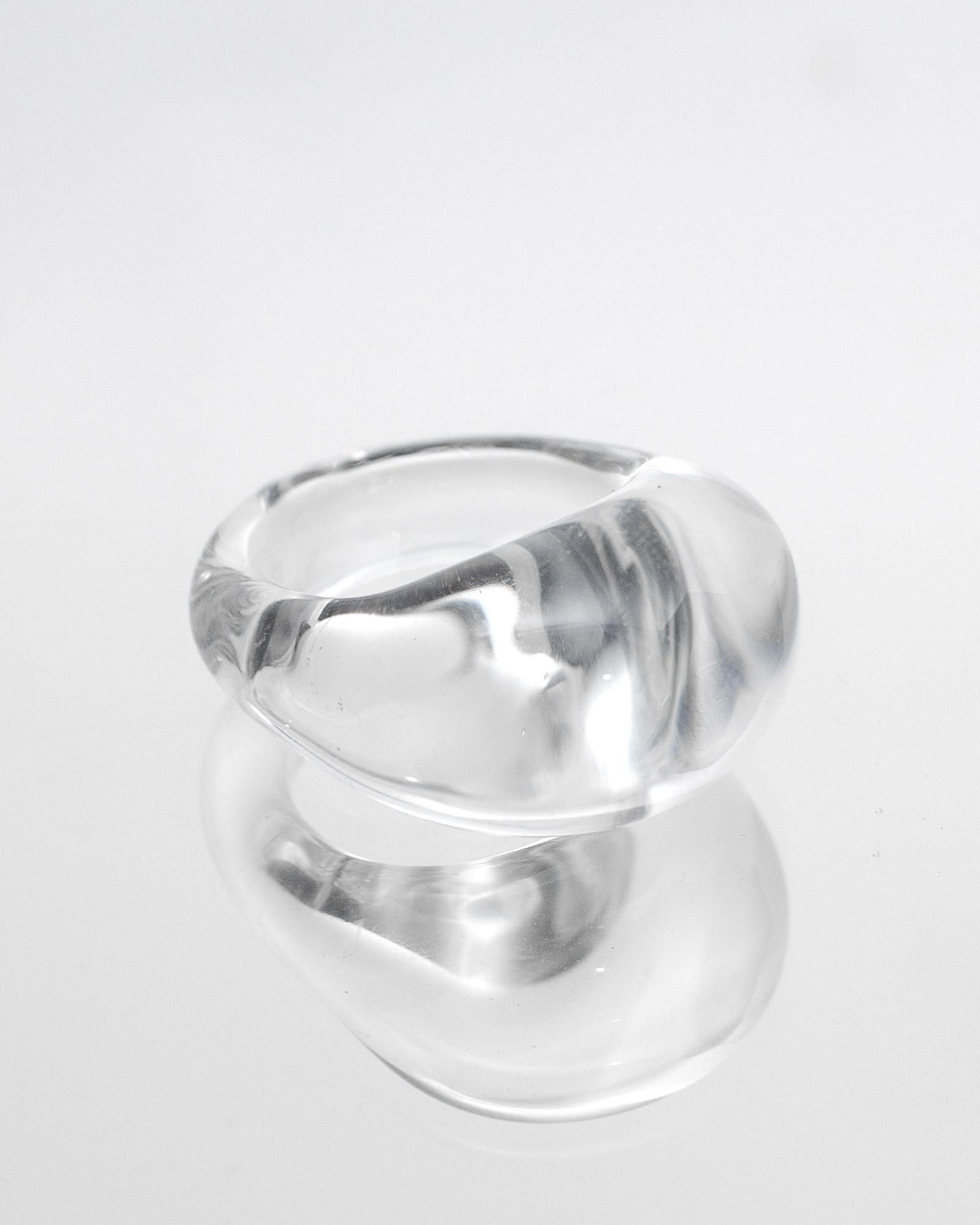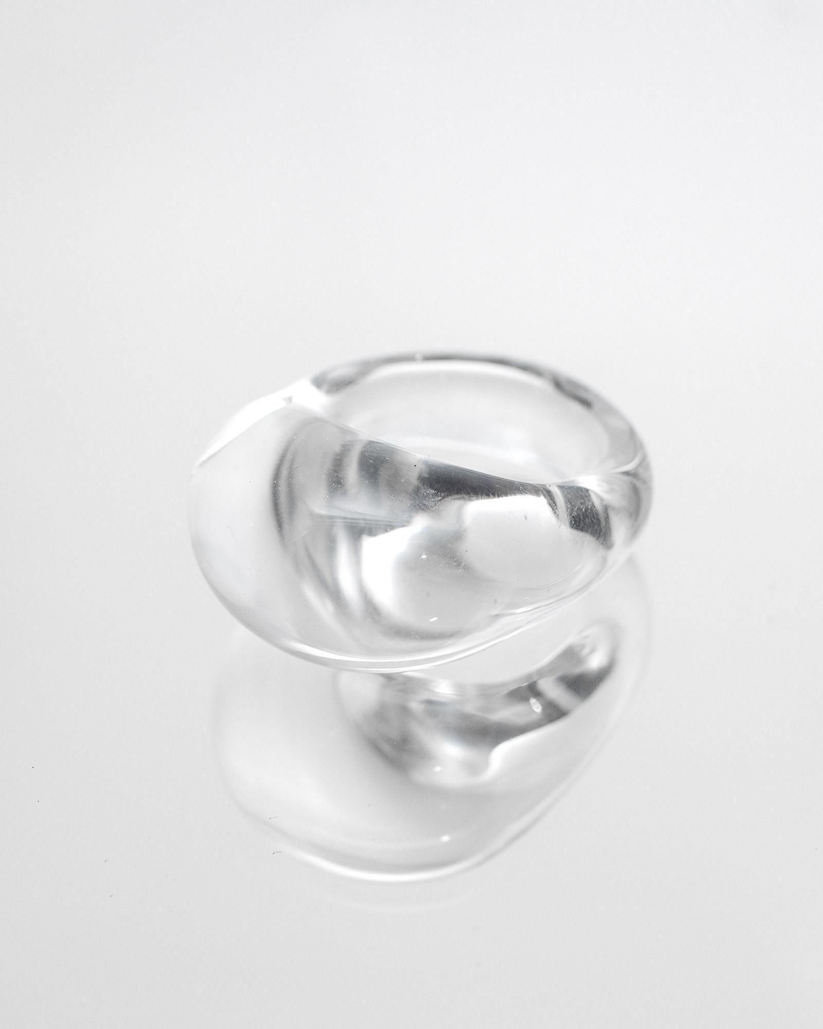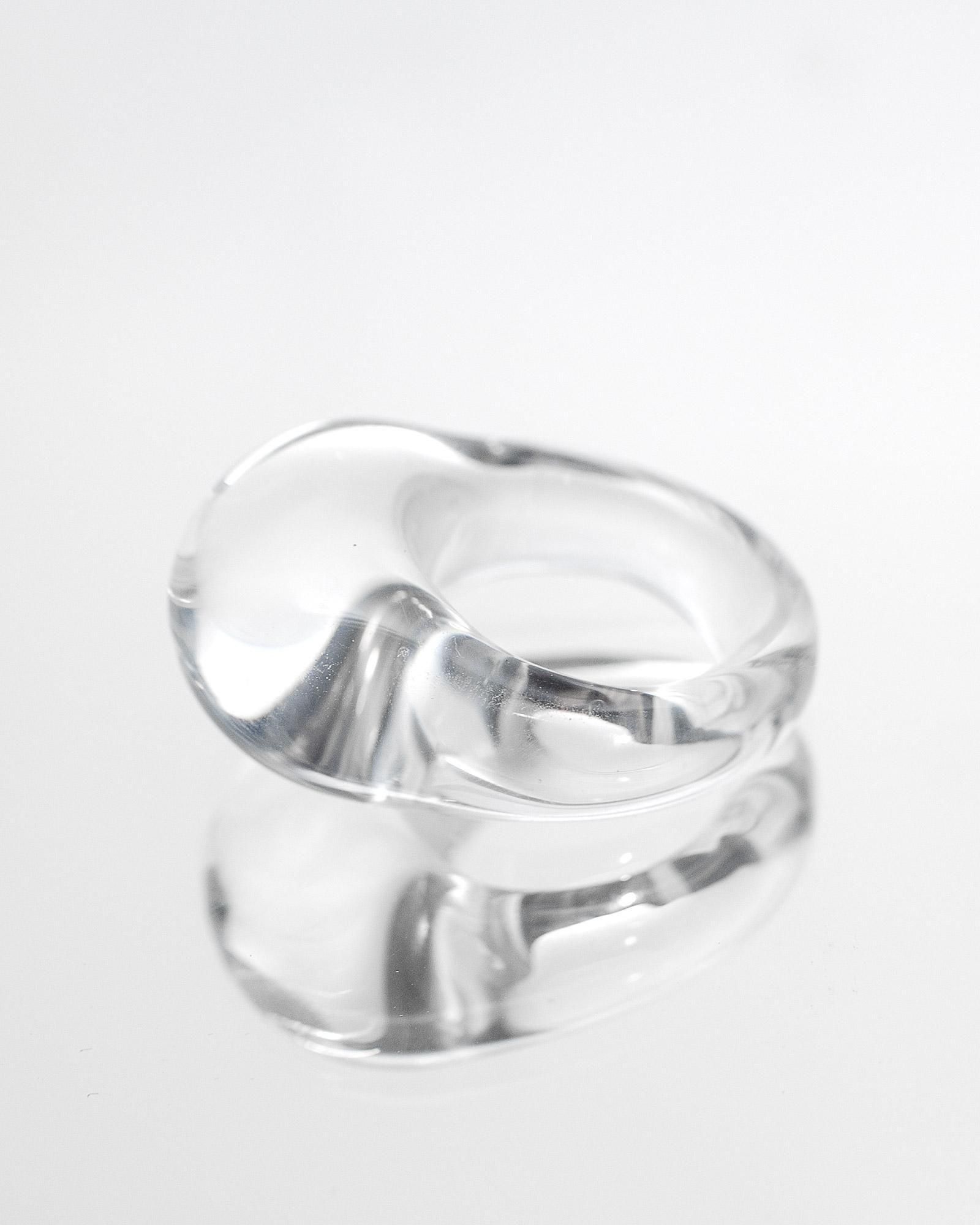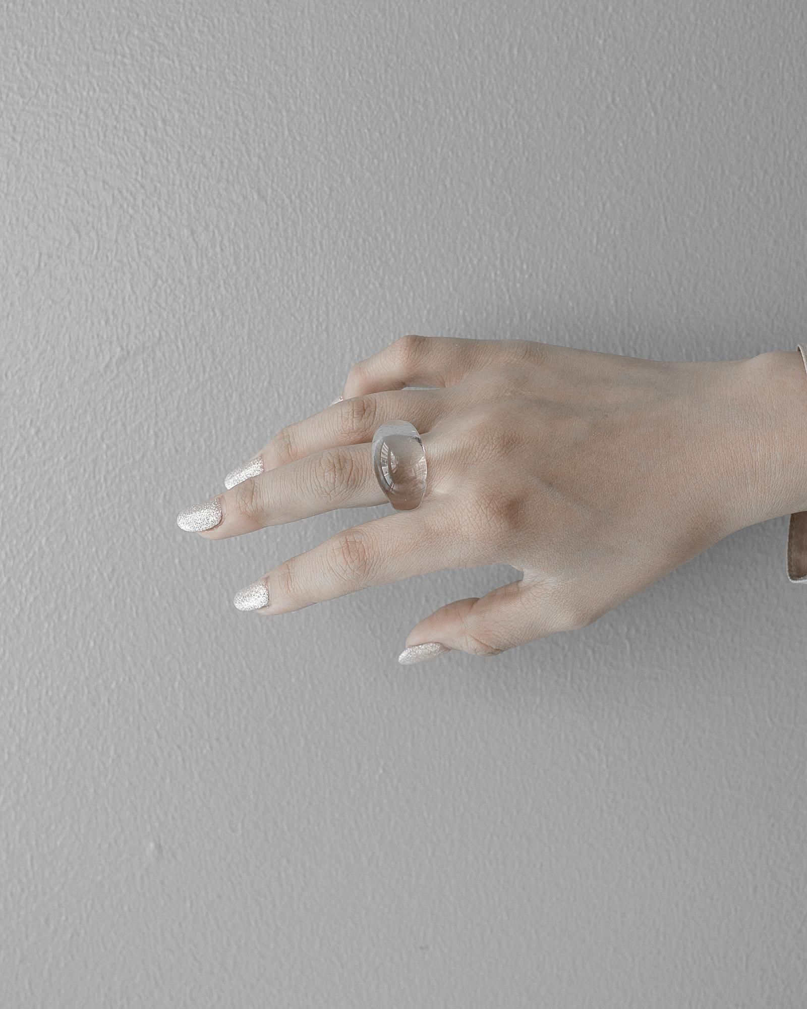 ランプワークによってつくられた透き通ったガラスがとても印象的なリングです。