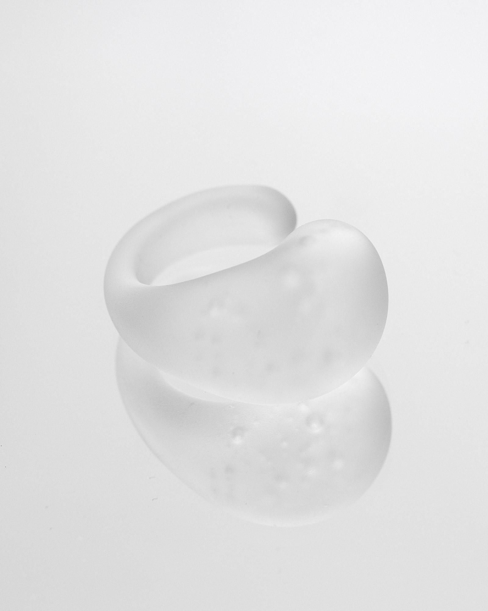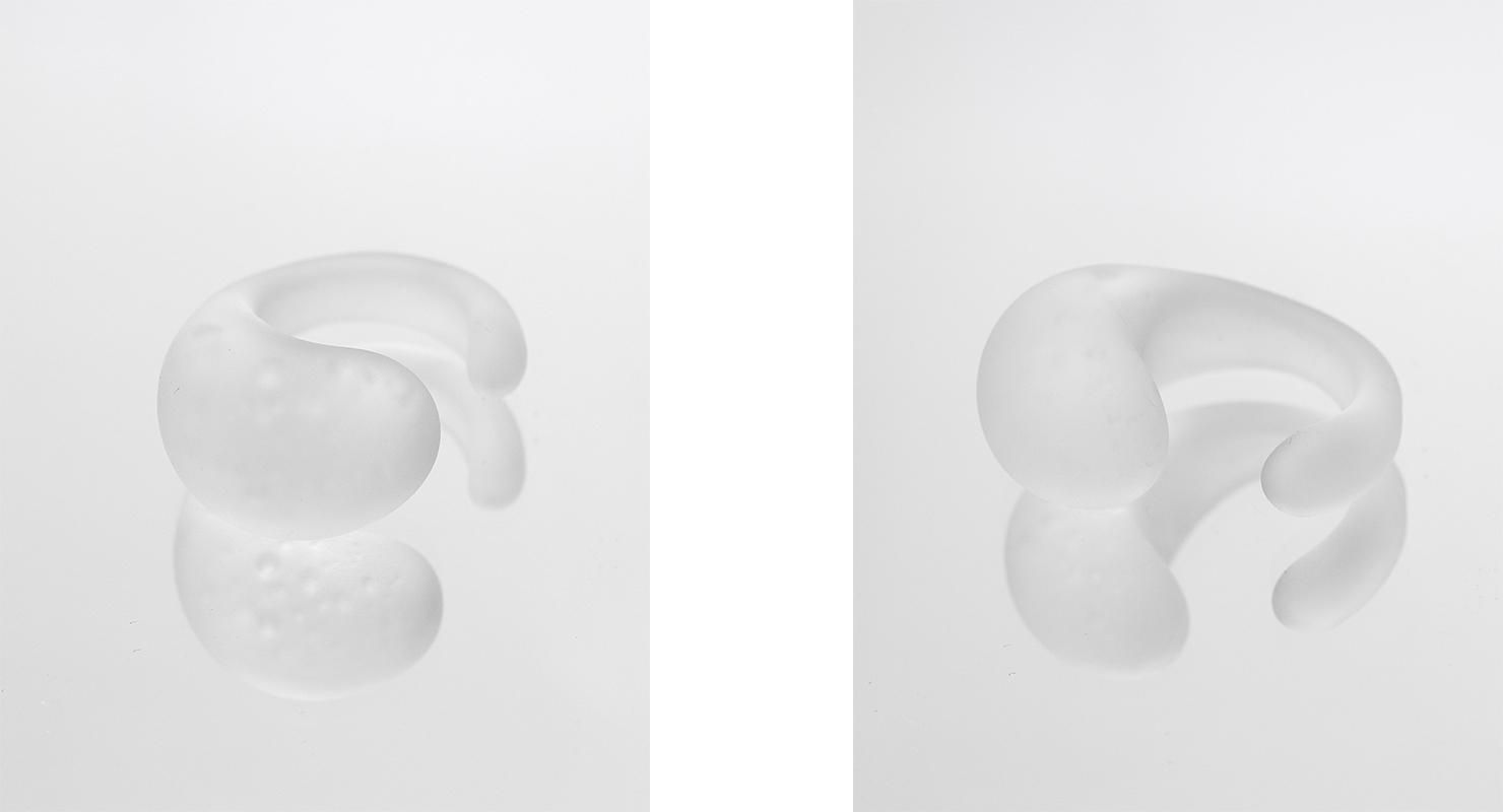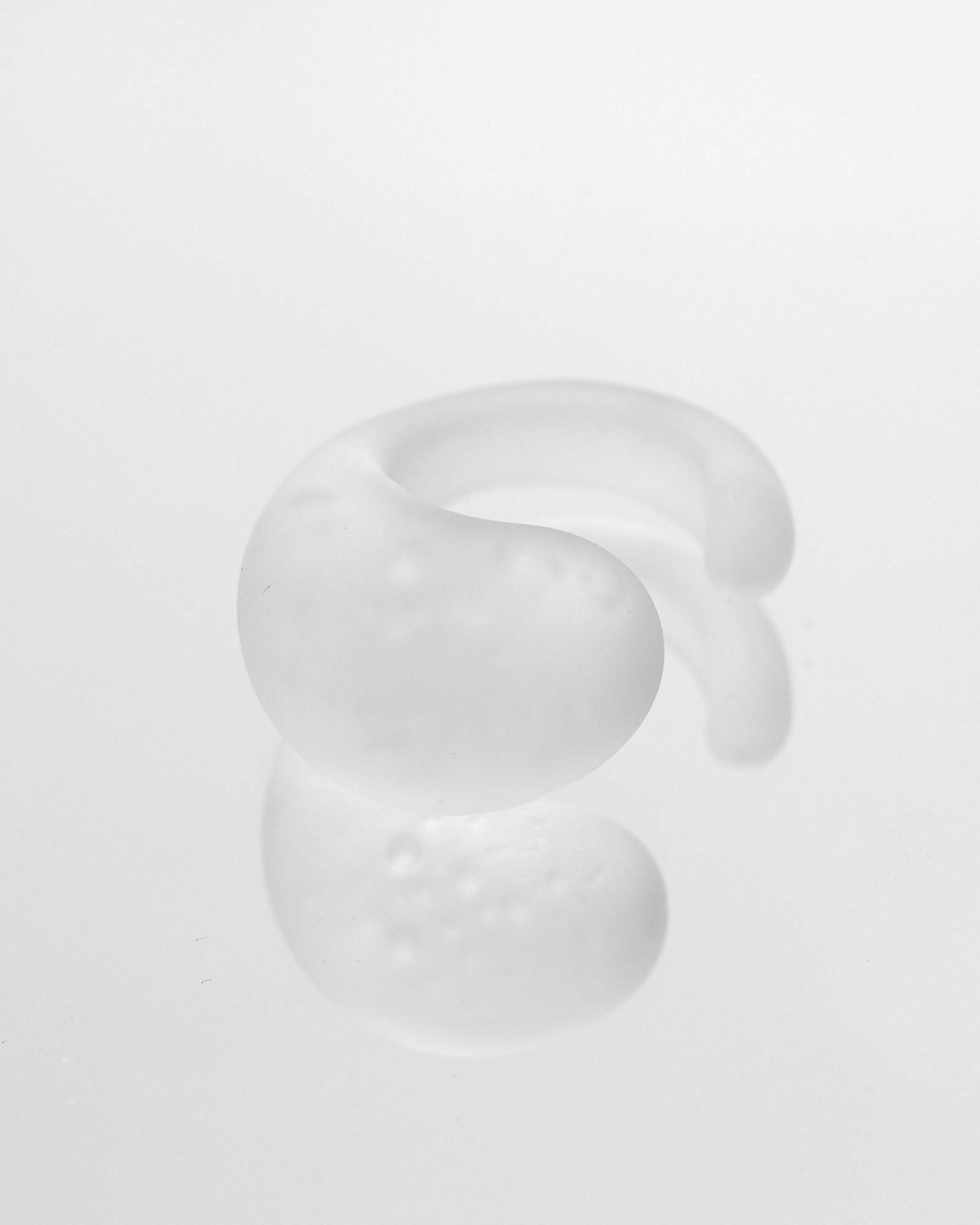 サンドブラストによるマットなテクスチャの中に大小様々な気泡が内包され、溶けて指に巻き付いたようなシルエットが美しく、