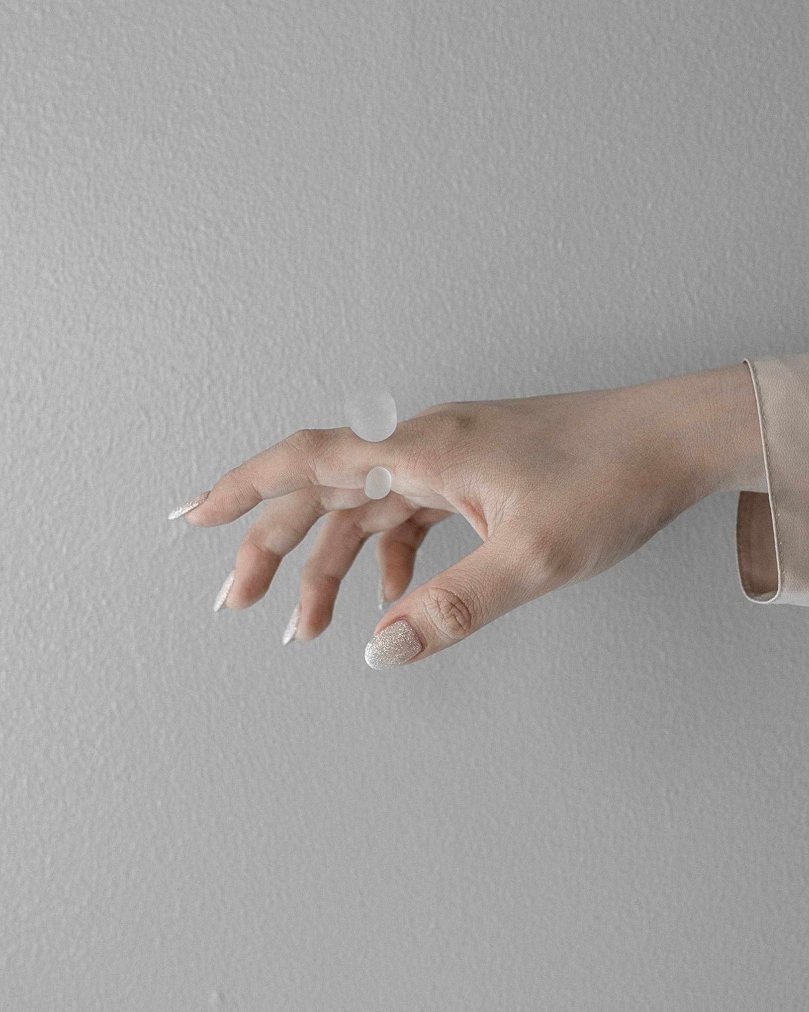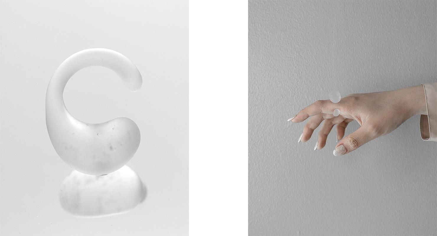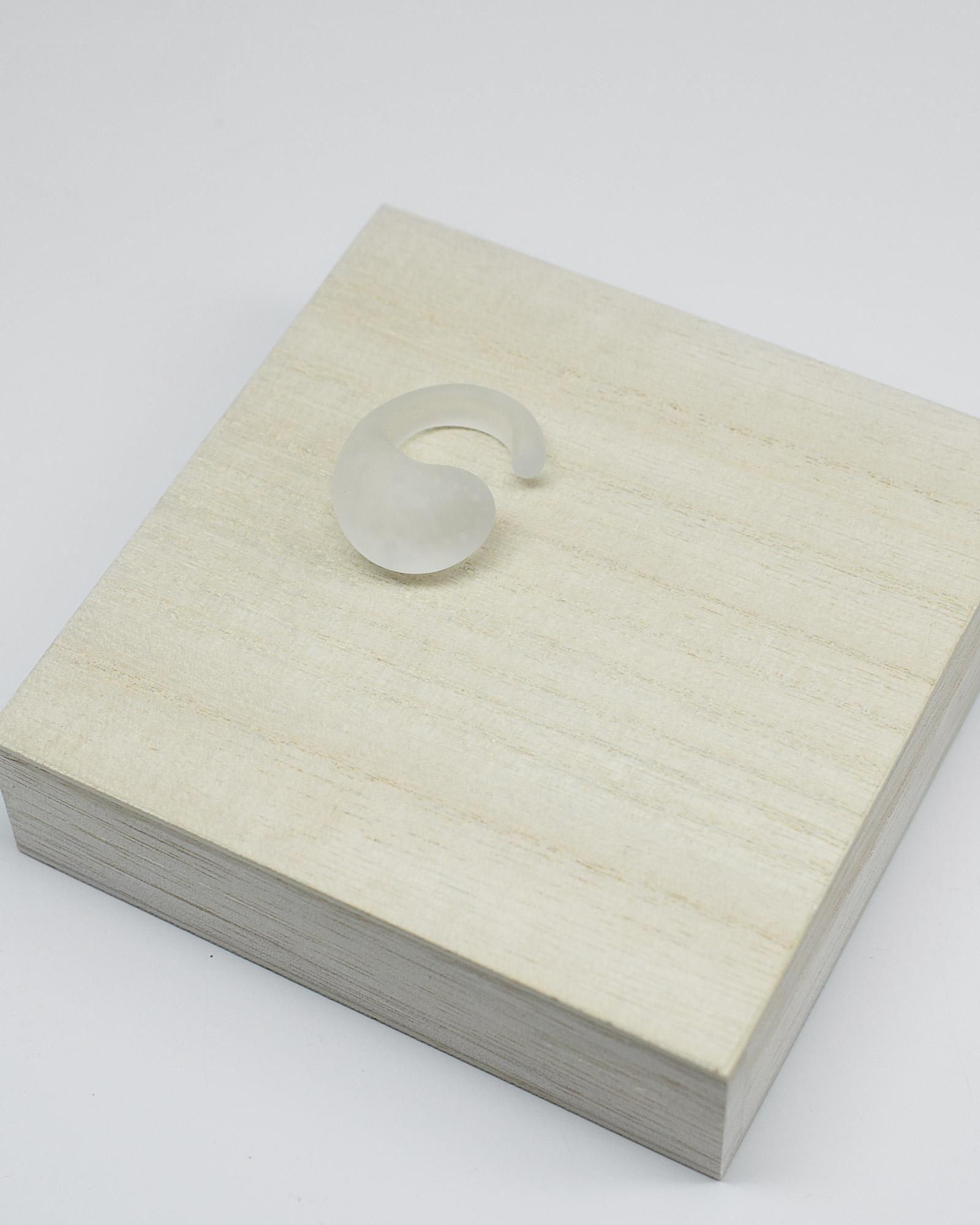 サンドブラストによるマットなテクスチャの中に大小様々な気泡が内包され、溶けて指に巻き付いたようなシルエットが美しく、
