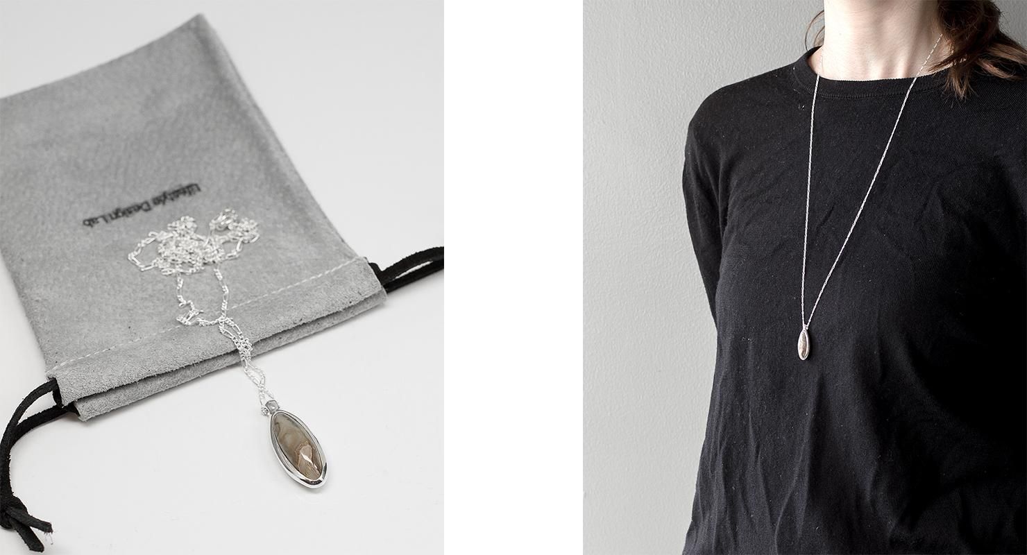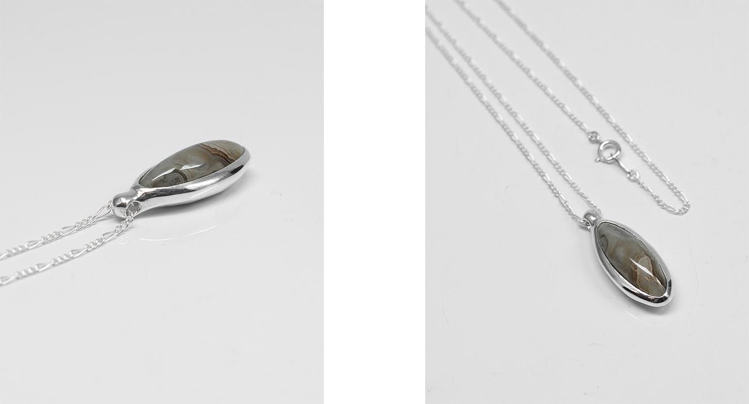 石を包んだネックレストップは流体のように緩くニュアンスのついた表面を丁寧に鏡面仕上げしており、