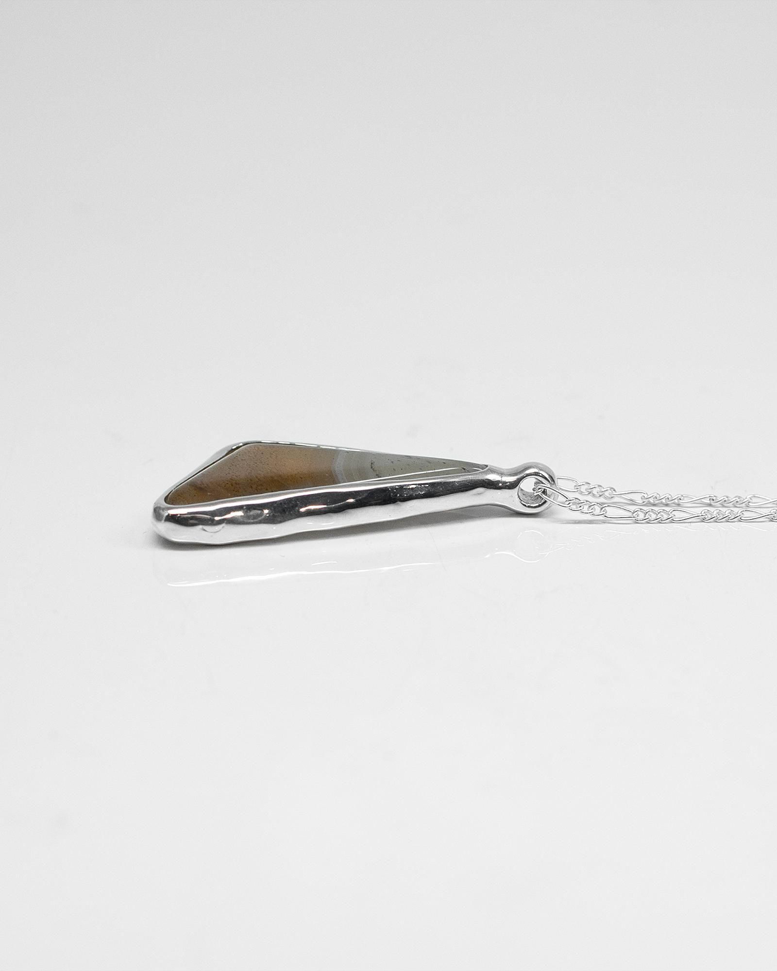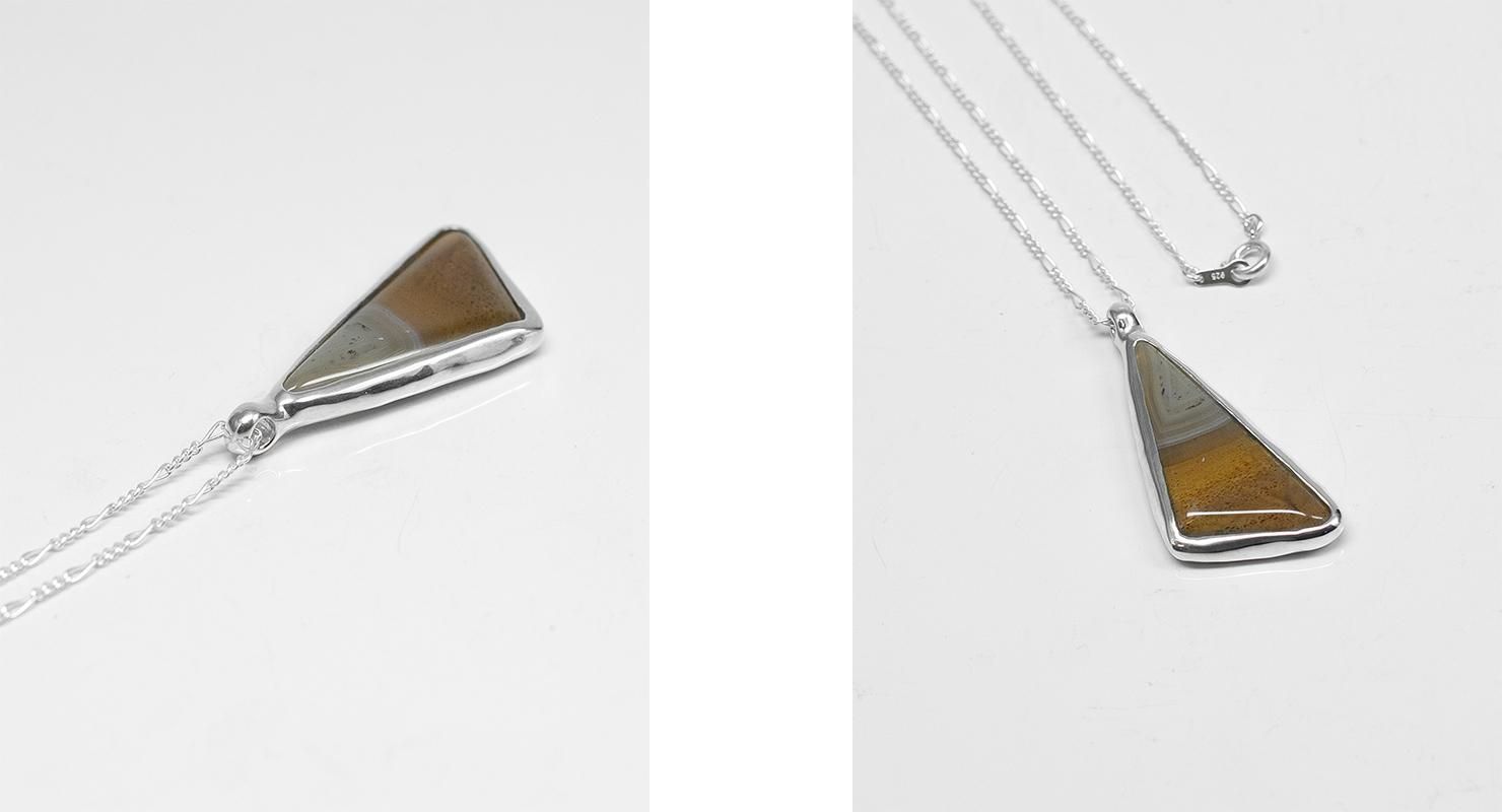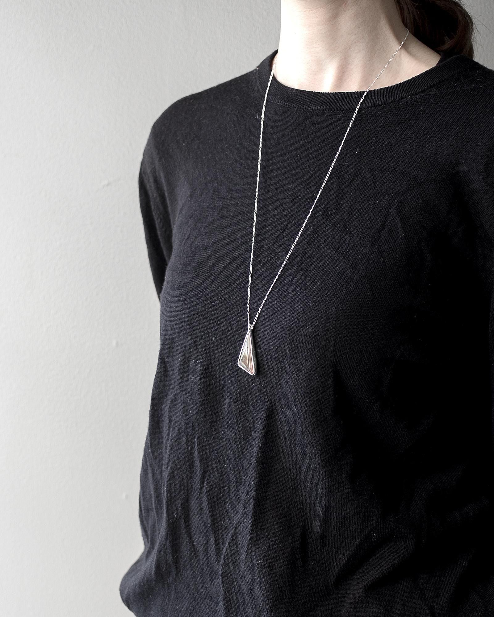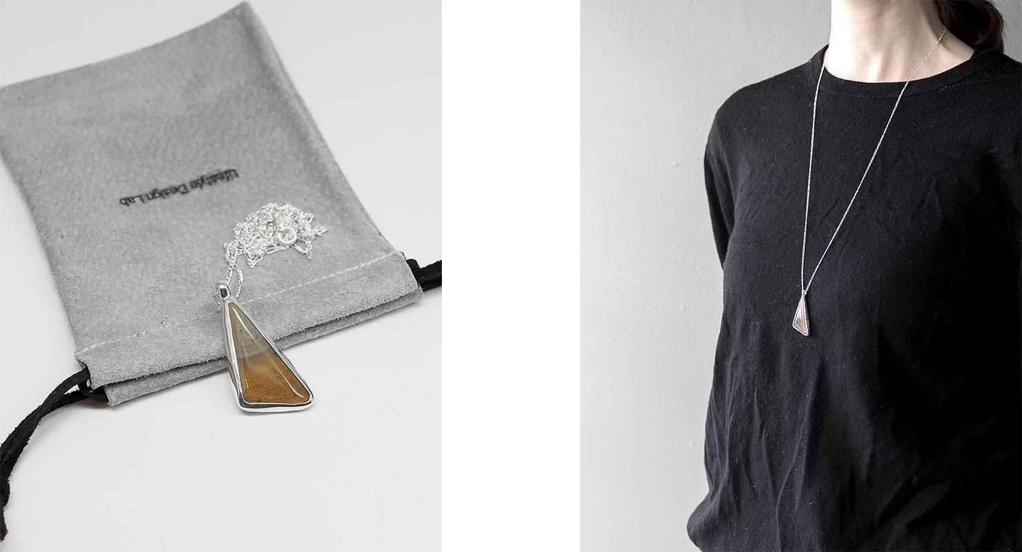 石を包んだネックレストップは流体のように緩くニュアンスのついた表面を丁寧に鏡面仕上げしており、