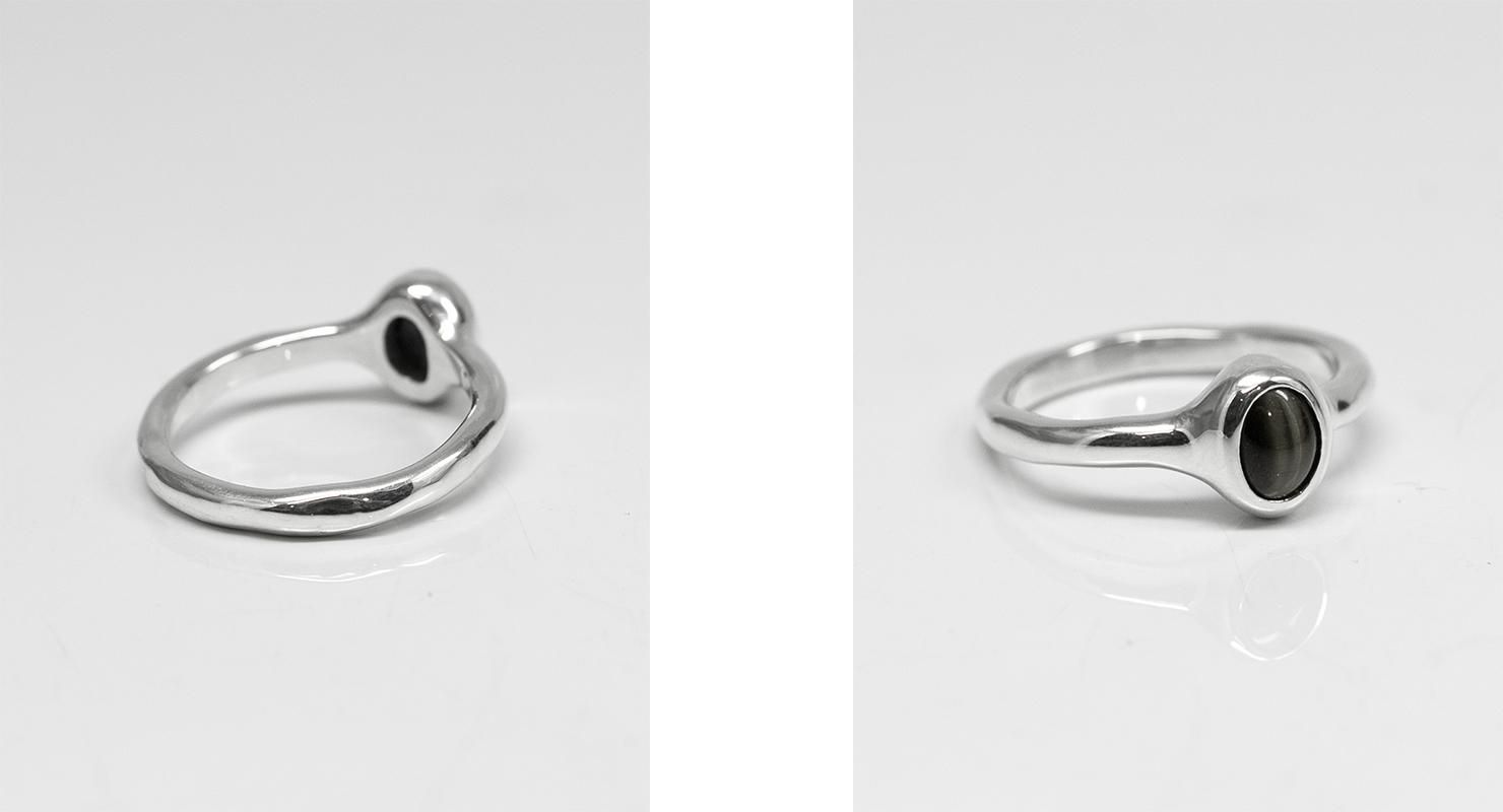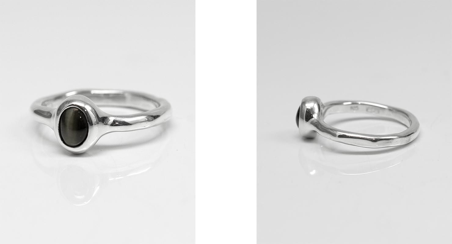Aquaをベースデザインにコーネルピンキャッツアイをセットしたシルバーリング。